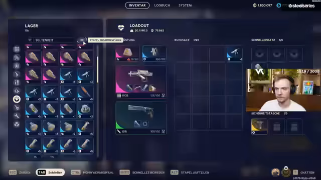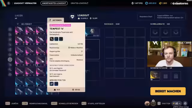 01:40:36Für eine neue Runde auf der Map 'Begabene Stadt' wird ein neues Waffen-Setup geplant. Es besteht aus einem Sniper für Distanz und einer Auspray für den Nahkampf. Der Streamer kauft Munition und einen Raider-Key, was die Gesamtkosten für das Setup auf über 105.000 Credits treibt. Dies wird als 'stolzer Preis' bezeichnet, aber aufgrund der maximalen Haltbarkeit der Osprey und der Bobcat gerechtfertigt.
