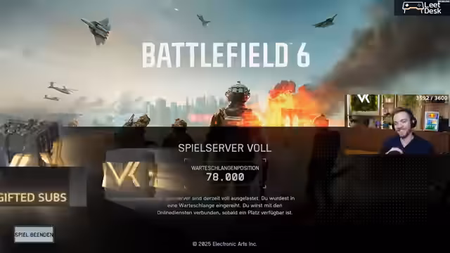 02:09:38Zu Beginn des Streams gab es erhebliche technische Probleme beim Zugang zum Spiel. Die Server-Warteschlange war extrem lang, zeitweise mit über 280.000 wartenden Spielern. Dies lag auch daran, dass Spieler über den EA Launcher keinen Preload durchführen konnten, was zu einem zeitlichen Nachteil führte. Der Streamer selbst war auf Konsole bereits im Spiel, während viele PC-Spieler, insbesondere auf Steam, noch auf die Warteschlange warten mussten. Die Erwartungen bezüglich der Stabilität waren gemischt, da die Beta bereits Probleme mit den Lobbys gezeigt hatte.