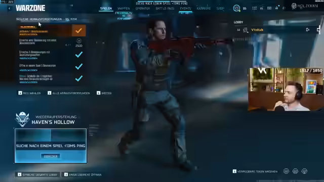 00:04:27Es wird die Möglichkeit von Custom Games auf der neuen Map Havens Hollow am Sonntag diskutiert, da die alten Verdansk- und Rebirth-Customs langweilig geworden sind. Der Streamer äußert seine Frustration über die Kartenrotation in Solos und bemerkt, dass der Solo-Modus nicht auswählbar ist, was er zunächst für einen Bug hält. Nach einem Neustart des Spiels bleibt das Problem bestehen, und er muss feststellen, dass er nur Duos oder Quads spielen kann, was ihn dazu zwingt, in den 'Einfach'-Modus zu wechseln, um bestimmte Herausforderungen für das Ballistikmesser zu erfüllen.