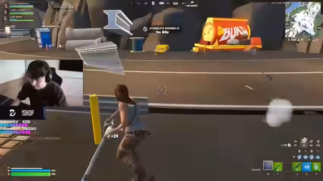 05:25:21Im Spiel eskaliert die Situation um die gegnerische Base. Streamer beobachten einen Gegner in ihrer eigenen Basis und planen einen Angriff. Es kommt zu einem heftigen Schusswechsel, bei dem sie einen Gegner mit 3 HP knapp verfehlen, während ein anderes Team in ihre Base eindringt. Spieler sind mit Ressourcen wie Schocken, Shockwaves und Crashpads ausgestattet und versuchen, den Vorteil zu nutzen, indem sie strategische Bauelemente editieren und Gegner aus der Luft angreifen. Die Gespräche sind von Adrenalin und schnellen Reaktionen geprägt, während die Team-Kommunikation zur Optimierung der Taktik läuft.