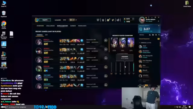 10:18:00Der Streamer beklagt, dass er trotz einer hervorragenden individuellen Leistung, bei der er ein Spiel "komplett rein smurft", trotzdem verliert. Dies führt ihn zu der Überlegung, dass er auch Troll-Picks spielen könnte, anstatt sich ständig auf Jinx zu konzentrieren, da der Spielspaß fehlt. Er kritisiert den Draft des Teams und empfindet das Spiel als "langweilig", da er mit 50 LP das Gefühl hat, dass seine Anstrengungen nicht belohnt werden. Er äußert, dass er mit Champions wie Kai'Sa Spaß haben könnte, aber die aktuelle Situation des Spiels ihm jegliche Freude nimmt.