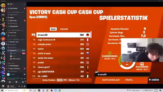 04:03:41Der Streamer zeigt die aktuellen Standings des EU Solo Cash Cups an. Spieler wie Sand Aura, Mr. Savage, Kick-Duo und Yannis werden erwähnt und teilweise als cheater oder qualifiziert bezeichnet. Besondere Aufmerksamkeit gilt Projekt Peterbot, das sich qualifiziert hat, und es gibt humorvolle Kommentare zur Leistung einzelner Spieler. Auch ein Abo-Bug wird diskutiert, der zur Disqualifikation führen kann.