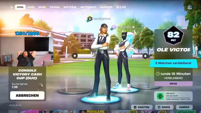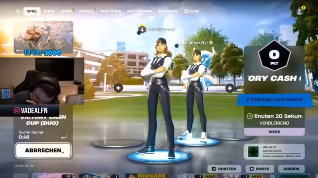 00:00:00Der Stream beginnt mit technischen Anlaufschwierigkeiten, da der Streamer versehentlich auf den falschen Account geloggt ist. Nach einem Neustart wird der Stream erfolgreich gestartet. Ein Fortnite-Update wird erwähnt, das für den benötigten Download verantwortlich ist. Nach einer kurzen Begrüßung im Chat wird das Ziel des Streams kommuniziert: die Qualifikation für den Squadier Pro-Cup auf der PC-Plattform. Die nötige Punktzahl von 250 wird als großes Ziel genannt und erste Spielpartner werden angesprochen.