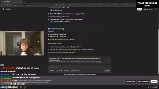 02:10:18Zu Beginn des Stream-Teils steht das gemeinschaftliche Zählen der Kalorien im Vordergrund. Nach dem Verzehr von zwei Frühlingsrollen und einem Chicken Ramen wird die Aufnahme von etwa 2500 bis 3000 Kalorien geschätzt. Der Streamer beklagt die hohe Kalorienzahl und überlegt, am darauf folgenden Tag fasten zu müssen, um das Ganze auszugleichen, was zur humorvollen Selbstreflexion über den aktuellen Essenskonsum und das bevorstehende Training führt. Darüber hinaus unterhält er sich über verschiedene Körpergerüche und stellt fest, dass diese nach Sport normal sind, aber auch gelegentlich bei ihm selbst auftreten können.