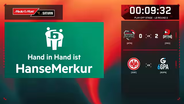 05:59:37Auf Matchpoint gegen 6GPA gelingt Eintracht Frankfurt eine kühne Attacke. Mit einem Überdrive und genauer Kommunikation nehmen sie den Spike sicher. 6GPA kontert zwar, aber Frankfurt wehrt den Anfall souverän ab. Mit dem sicheren Punktgewinn schließt Eintracht Frankfurt das Match mit einem klaren 2:0 ab und sichert sich das Ticket für die Finals in Köln.