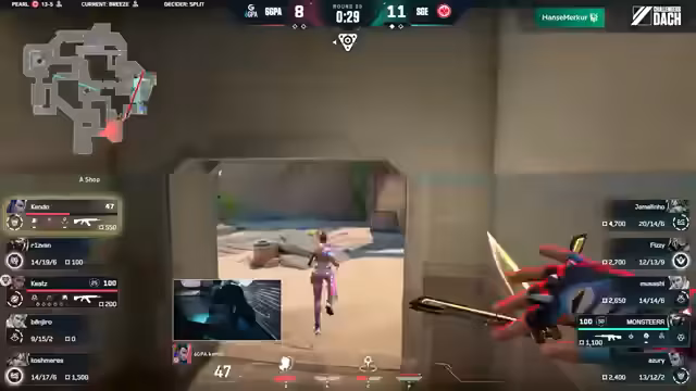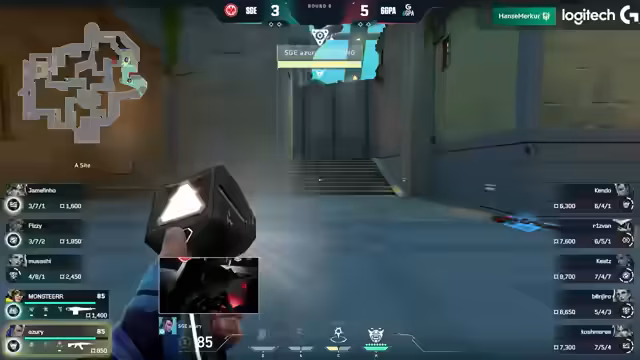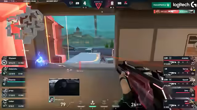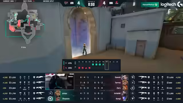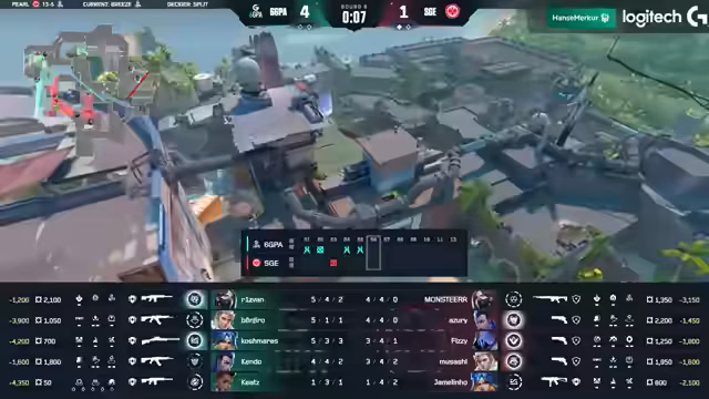 04:06:18Das Match beginnt auf der Map Pearl. Es wird ein fast identisches Line-up auf beiden Seiten beobachtet, das nur in den Controllern Cypher und Killjoy variiert. 6GPA startet in der Attacke und muss einen Force-Buy nach einer 2-2-Situation spielen. Der Versuch scheitert, jedoch kann ein Spieler namens Fizzeh eine 1-2-Situation für sein Team retten und zeigt dabei starke Einzelleistung.