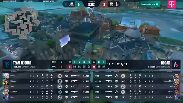 04:50:38Das Spiel entwickelt sich zu einem absoluten Ping-Pong mit ständigen Führungswechseln und beiden Teams im Double-Dip. Auf Haven gelingt es Leisure, einen Matchpoint zu erzielen, wird aber durch einen starken Retake von Bodax in Verlegenheit gebracht. In der darauffolgenden Runde nutzt Ben eine Hunter's Fury für einen entscheidenden Doppelkill, wodurch Leisure auf Matchpunkt kommt. Nach einem weiteren knappen Fight sichert sich Leisure mit einem 2:0 die Serie und die nächsten 100 Euro Bounty.