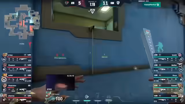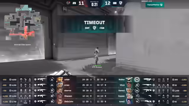 01:04:10Nachdem CJN ATN mit geduldigem Spiel und einem überzähligen Spieler in eine zahlenmäßige Unterlegenheit manövriert, ist ATN gezwungen, ein Force-Buy zu spielen. Dieses Buy ist zunächst erfolgreich, als ein Spieler den ersten Frag erzielt und sich zurückziehen kann. Allerdings kann ein sofortiger Trade gesetzt werden, und der restliche Force-Buy von ATN scheitert. CJN gewinnt die Runde und führt mit 7:0. Der Spike wird von CGN platziert und der Countdown läuft für den Sieg.