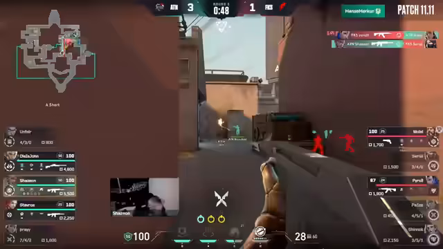 01:50:40Die erste Buy-Runde von Focus verläuft äußerst erfolgreich. Nach einem ersten, gescheiterten Versuch nutzen sie eine Überzahlsituation, die durch ein starkes Viperspiel von Pace geschaffen wird. Serial rettet die Runde mit vier Kills mit der Ghost. Fokus geht früh 1:0 in Führung. Der Gegner, Ryzen, beginnt defensiv und versucht, Map-Kontrolle aufzubauen, während Fokus aggressiv Druck ausübt und durch AIM-Fehler von Ryzen in Vorteil gelangt.