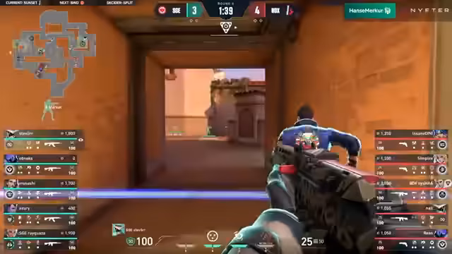 03:59:03Die zweite Map des Match of the Week zwischen Bodax Gaming und Eintracht Frankfurt beginnt nach einer spannenden ersten Map, die 13 zu 11 für Eintracht Frankfurt endete. Das Ergebnis war knapper als erwartet, da SGE Zeit brauchte, um sich in das Interims-Line-Up mit Stevie und Kami einzufinden. Kami, ein junger Brite als Tryout, zeigte einen super Einstand an der Waylay auf Sunset und ist Top-Frager auf dem Server, während Nisha am Sova ebenfalls stark spielte. Bodax zeigte einen guten Start und konnte auch in Phasen, in denen Frankfurt die Kontrolle hatte, mit guten Aktionen in der Defensive zurück ins Spiel finden.