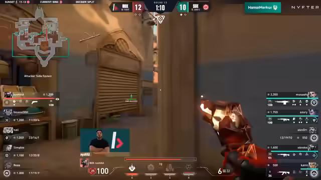 02:53:14Der Spielstart ist intensiv, mit Bodax Gaming im Angriff. Die erste Pistol Round geht an Bodax, was einen frühen Vorteil verschafft. Die Team-Comps werden analysiert: Bodax spielt mit Double Duelist Weyla Yoru, während SGE auf Double Sentinel mit Deadlock Cypher setzt. Es gibt eine kurze technische Pause. Die Kommentatoren kommentieren die Anonymität des neuen Spielers Kami, der den Ingame-Namen Rayquaza trägt. Die zweite Runde geht ebenfalls an Bodax, die sehr kalkuliert und durchdacht agieren. Eintracht Frankfurt holt sich die dritte Runde, trotz eines guten Starts von Bodax. Die Kommunikation wird als Herausforderung für SGE betrachtet, da sie nun auf Englisch callen müssen. Bodax zeigt sich stark in der Defensive, während Frankfurt versucht, mit aggressiven Aktionen und Flanks zu punkten. Die Halbzeit endet mit einer Führung für Bodax Gaming, obwohl Eintracht Frankfurt in einigen Runden gute Ansätze zeigte und sich eine fünfte Runde sichern konnte.