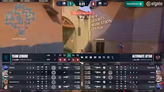 01:36:55Die Runden auf Corrode sind von unerwarteten Wendungen geprägt. Shazeion von Attax wird in seiner eigenen Smoke überrascht und geht down, während der Showstopper von Leisure Anker findet und Steel Garden gezogen wird. Ein unglücklicher Fallschaden-Tod von John, der in der Luft getroffen wird, führt zum Verlust einer wichtigen Runde für Attax. Trotz eines Gewinns der Eco-Runde muss Attax direkt danach wieder in die Eco, was ihre Wirtschaft schwächt. Leisure nutzt diese Situation aus und baut seine Führung weiter aus. Mit einer starken Kontrolle der Mitte und effektiven Rotationen sichert sich Leisure die Halbzeitführung mit 7 zu 2. Attax hat sichtlich Probleme in der Defensive und muss sich neu aufstellen, um im Spiel zu bleiben.