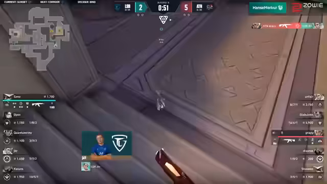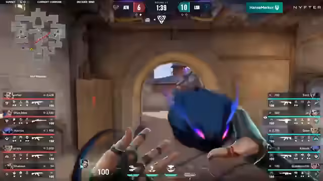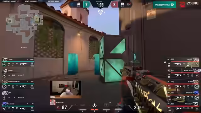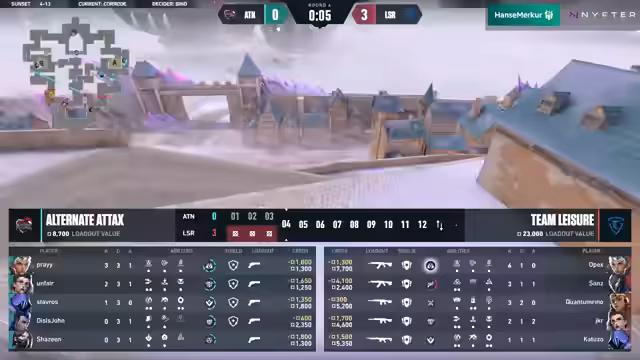 00:41:14In der ersten Buy-Round sind beide Teams ultimativ relativ gleichauf. ATN erzielt erneut ein schnelles Opening, indem die Wall aufgeschossen wird, ohne dass ein Frag entsteht. Suns geht down. Joker wird von der Cypher Ultimate aufgedeckt. John hat Glück, nicht abgefangen zu werden. Cattuso macht die Tür zu und verrät sich. Der Spike wird geplantet, und ATN fängt die Rotation in der Mitte ab. ATN zeigt sich sehr souverän und gewinnt das Duell in der Mitte. Cattuso versucht, seine Waffe zu retten, wird aber von Anfer im 1v1 besiegt. ATN nimmt die dritte Runde mit und führt 3:1. Leisure hat nur einen Überlebenden, was eine weitere Sparrunde bedeutet. John nutzt weiterhin seine One-Way-Taktik, um Openings zu erzielen und sich mit seinem TP zurückzuziehen. Leisure muss hier Veränderungen vornehmen. In der Eco-Runde sind sie zu viert vor A. ATN spielt sehr gut. Prey gewinnt das Duell gegen Suns am B-Spot. Anfer erzielt einen Doppelkill im Market, aber Quantum Reno fängt ihn ab. Prey fängt die nächste Rotation ab. Quantum Reno ist allein gegen drei, hat aber die Wände. John ist sofort zur Stelle und ATN gewinnt die vierte Runde. Anfer zeigt eine Heldentat im Market und Leisure hat Schwierigkeiten, mit der Attack von ATN klarzukommen.