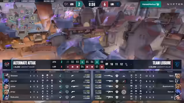 00:58:25Nach der Pause startet Team Leisure überraschend stark in die zweite Halbzeit auf Sunset und gewinnt die Pistol-Runde. Mit einer cleveren Verteidigung am Markt und dem Blocken von Zugängen durch eine Sage-Wall können sie die Angriffe von Alternate Attax abwehren. Shazeion spielt eine Schlüsselrolle, indem er wichtige Kills erzielt und den Vormarsch von Attax stoppt. Dieser unerwartete Erfolg gibt Leisure Hoffnung auf ein Comeback, besonders da Attax in der folgenden Runde nur mit Pistolen ausgerüstet ist. Obwohl Attax in der Eco-Runde erneut dominant auftritt und schnell Kills erzielt, zeigt Leisure, dass sie in der Lage sind, Widerstand zu leisten und die Dynamik des Spiels zu beeinflussen. Die Runde endet jedoch erneut zugunsten von Attax, die ihre Überlegenheit unter Beweis stellen.