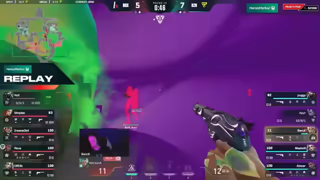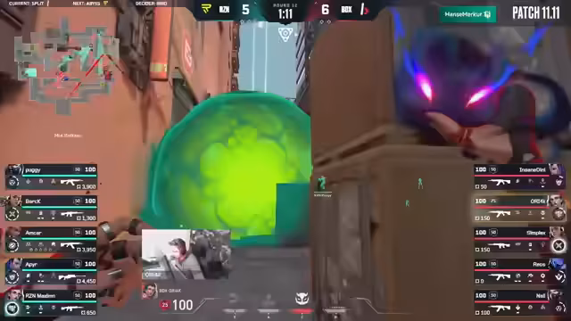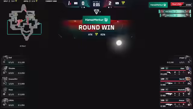 01:47:15Nach dem verlorennen Split ist RZN mit dem Rücken zur Wand und agiert auf Abyss extrem konzentriert und aggressiv. Das Team kontrolliert die Mitte und gewinnt Duelle souverän. RZNs Retakes sind eine Waffe und führen zu Runden gegen die Eco von Bodax. Ein Schlüsselmoment ist der Sieg von RZN im Retake nach einem 5v4, bei dem das Team trotz Überzahl und schlechter Waffenausstattung den Spike verteidigt. Dies sichert RZN den 5:0-Start auf Abyss und zeigt ihre Entschlossenheit, das Match zu drehen.