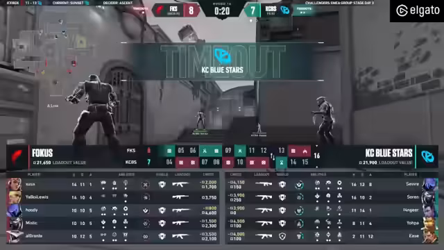 00:28:21Nach einem Timeout von Carmine Corp Blue Stars dreht sich das Spiel etwas. KCBS beginnt, Runden zu gewinnen, indem sie besser agieren und mehrere Kills in einem Zeitraum erzielen. Sie nutzen ihre Ultime (wie Gekko) geschickt. Fokus gerät in finanzielle Schwierigkeiten und muss sparen, während KCBS Momentum aufbaut. Trotzdem gelingt es Fokus in der letzten Runde der ersten Halbzeit durch ein unkonventionelles und starkes Play, geführt von Alorante, die Führung zu halten und mit 8-7 in die Pause zu gehen.