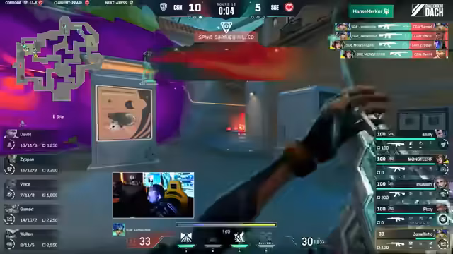 02:42:00Das Grand Final auf der Map Pearl ist äußerst umkämpft. CGN führt bereits mit 8:4, doch Eintracht Frankfurt zeigt kämpferischen Charakter und holt sich vier Runden zurück. Frankfurt benötigt ein Comeback, um die Map noch zu drehen, während CJN mit einem starken Pistolenrunden-Vorteil weiter den Druck erhöht. Die Spieler beider Teams kämpfen um jeden einzelnen Zoll auf dem Server.
