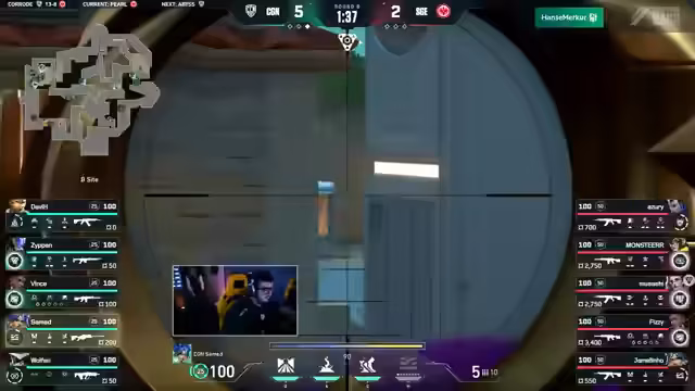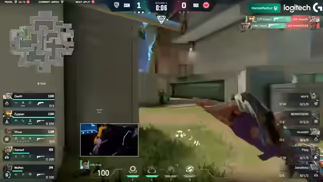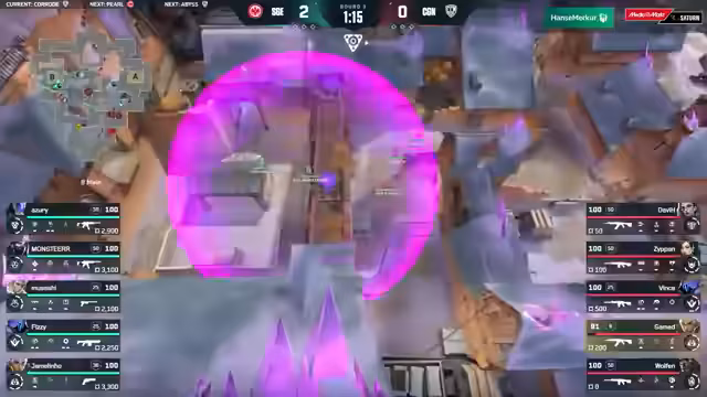 03:34:37Auf der Map Abyss startet CGN fulminant und gewinnt die Pistol Round flawlos. Die Kölner agieren aggressiv und setzen die Verteidigung von Frankfurt unter massiven Druck. Ihr strategischer Aufbau mit Waylay und Interceptoren erzielt sofort Wirkung. Frankfurt hat Schwierigkeiten, in das Spiel zu finden und gerät früh in einen gefährlichen Rückstand.