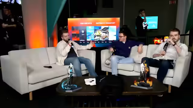 03:13:52Nach dem zweiten Map-Gewinn von CGN stehen die Kommentatoren vor einer Prognose. Die meisten Experten sehen die Kölner auf dem Weg zu einem klaren 3:0-Erfolg. Die SGE kämpft jedoch mental und physisch mit den Strapazen des Turniers. Die Analysten diskutieren über die Map-Vetos und Agenten-Wahlen für die entscheidende darte Map Abyss und fragen, ob Frankfurt noch einmal zurückkämpfen kann oder ob CJN das Finale frühzeitig für sich entscheidet.