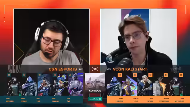 00:27:55Die zweite Partie des Abends wird CGN eSports gegen VivaCGN Kaltstadt sein, das Main-Team gegen das Community-Team von CGN. Kaltstadt wird jedoch als Challenger-Niveau-Team mit bekannten Namen wie SPMAC und Lele eingeschätzt. Bei beiden Matches geht es um das Erringen von Cashout und Kopfgeld. Patrick Ackermask stößt zum Cast hinzu und es kommt zu einem kurzen Schlagabtausch mit Hetschinski. Beide Teams, CGN und Kaltstadt, haben den ersten Spieltag gewonnen, was die heutige Begegnung besonders spannend macht. Ein Coach-Interview mit Benni von Alternate Attax und Kuro von Coffeeshop folgt. Benni erklärt, dass sie Spieler testen, um ihren fünften Spieler zu finden, und Ceri als Duelist eingesetzt wird. Kuro betont, dass Coffeeshop sich gegen ein Tier-2-Team beweisen möchte und nichts zu verlieren hat. Die Map-Vetos werden diskutiert, wobei Bind als atypische Test-Map für Attax' Spielweise angesehen wird. Es wird eine Verzögerung aufgrund eines Patches bekannt gegeben, was zu einem kurzfristigen Spielerwechsel bei Alternate Attax führt: Blossi springt für Stavros ein, dessen Client nicht aktuell ist.