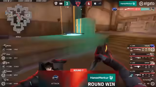 02:03:08Auf der zweiten Map Sunset startete Alternate Attacks in der Defensive, wobei vier Spieler am A-Spot positioniert waren und Cypher (Schaseon) alleine B deckte. Diese proaktive Spielweise ermöglichte es ihnen, einen Ult-Punkt zu sammeln. Coffeeshop zeigte sich in den ersten Runden sehr kompakt und trade-heavy, was sich als effektiv erwies, auch wenn sie die ersten Runden verloren. Besonders die Outlaw in den Händen von Ceri zwang Coffeeshop dazu, in der dritten Runde auf große Schilder zu achten. Prey zeigte eine beeindruckende Leistung mit vier Kills in einer Runde, was die Bonusrunde für Alternate Attacks sehr gut aussehen ließ. Coffeeshop hatte jedoch Schwierigkeiten, ihre eigene Attacke durchzubringen, und ihr Spiel wirkte oft zu langsam und passiv. Trotzdem gelang es Coffeeshop, eine Eco-Runde zu gewinnen, was ihre Fähigkeit unterstreicht, auch unter schwierigen Bedingungen erfolgreich zu sein.