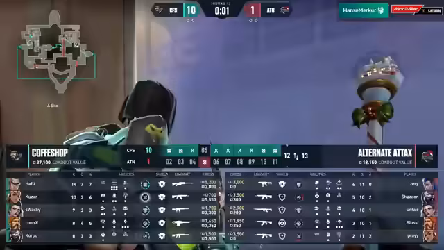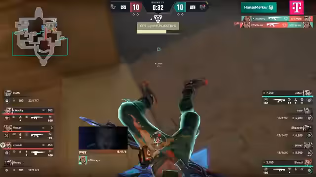 00:47:05Das Match of the Week zwischen Alternate Attax und Coffeeshop beginnt auf der ersten Map Bind. Coffeeshop besitzt aktuell 200 Euro Bounty und 100 Euro Cashout. Ein Sieg gegen Attax würde ihnen weitere 100 Euro Bounty einbringen, jedoch kein zusätzliches Cashout, da Attax letzte Woche verloren hat. Die erste Runde startet mit einem frühen Push von Attax auf die A-Side mit einer tiefen Viper-Wall. Kuro von Coffeeshop erzielt einen Opening-Doppelkill, gefolgt von einem weiteren Kill, was zu einem 2 gegen 2 führt. Trotz besserer Positionierung von Attax und Kenntnis der Gegnerpositionen, spielt Unfair einen weiten Flank-Weg, während Seri alleine auf der Site zurückbleibt. Kuro sichert den vierten Kill und Hafti defused den Spike, wodurch Coffeeshop die erste Runde gewinnt. Die Art und Weise, wie Unfair und Seri die Runde spielen, wird kritisiert, insbesondere Seris frühes Fallen und Unfairs Laufweg. Coffeeshop gewinnt auch die zweite Runde, wobei Hafti einen Vierer-Kill erzielt. Attax wirkt noch nicht ganz wach und spielt zu ängstlich und vorsichtig, was sich in der dritten Runde fortsetzt. Kusa von Coffeeshop eliminiert Seri und Prey, was zur Bonusrunde für Coffeeshop führt, die sie ebenfalls gewinnen. Attax liegt 0:3 zurück und macht zu viele kleine Fehler.