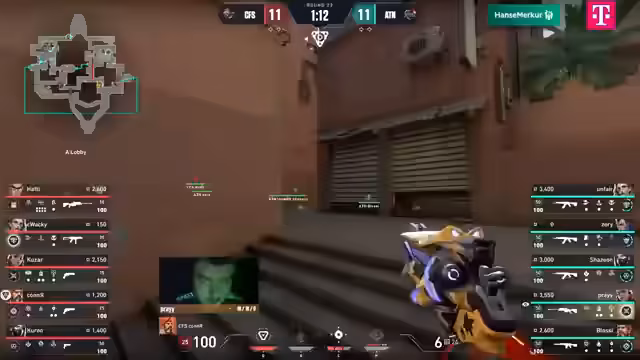 01:11:14Nach einer kurzen technischen Pause, die die Kommentatoren mit Humor nehmen, geht das Spiel weiter mit einem Stand von 10-2 für Coffeeshop. ATX muss diese Runde unbedingt gewinnen, um nicht komplett den Anschluss zu verlieren. Sie versuchen ein Default-Play mit einer Smoke in Richtung Showers, um den Ult-Punkt für Raze zu sichern. Coffeeshop wartet auf eine Aktion von ATX, die jedoch nur wenig Infoplay zeigt. ATX beginnt schließlich mit einem Execute auf B, aber ohne TP für eine schnelle Rotation. Prey positioniert sich gut in den Showers, um den Go von Coffeeshop zu unterbrechen. Trotz eines guten Riechers von Coffeeshop-Spielern und einem aggressiven Push, gelingt es ATX, die Runde durch einen Clutch von Anfair zu gewinnen. Dies ist eine wichtige Runde für ATX, um Stabilität zu finden, auch wenn sie noch nicht vollständig zufriedenstellend spielen.