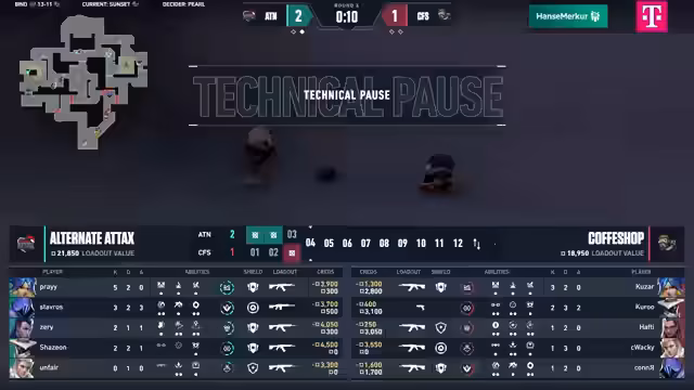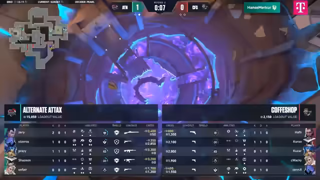 02:14:15Das Spiel auf Sunset zeigte Coffeeshop weiterhin sehr kompakt und trade-heavy, was sich als effektiv erwies, auch wenn Alternate Attacks die ersten Runden für sich entscheiden konnte. Besonders der aggressive Push von Coffeeshop und die schnellen Trades führten zu Überzahlsituationen. Alternate Attacks musste sich überlegen, wie sie gegen diese kompakte Spielweise vorgehen wollten, und es wurde ein eher Retake-lastiges Spiel für die nächsten Runden erwartet. Trotzdem gelang es Alternate Attacks, durch geschickte Flashes und schnelle Frags wieder ins Spiel zu kommen. Prey zeigte eine herausragende Leistung mit einem Slide und Sprint, der ihn zu einem unmöglichen Ziel machte und Alternate Attacks eine wichtige Runde sicherte. Das Timing und die Entscheidungen von Spielern wie Shazeon, der den Druck auf Kuro nutzte, um den Ausgleich zum 5:5 zu erzielen, waren entscheidend. Coffeeshop musste trotz des Spike-Plants in eine Eco-Runde gehen, was die Intensität des Matches unterstrich.