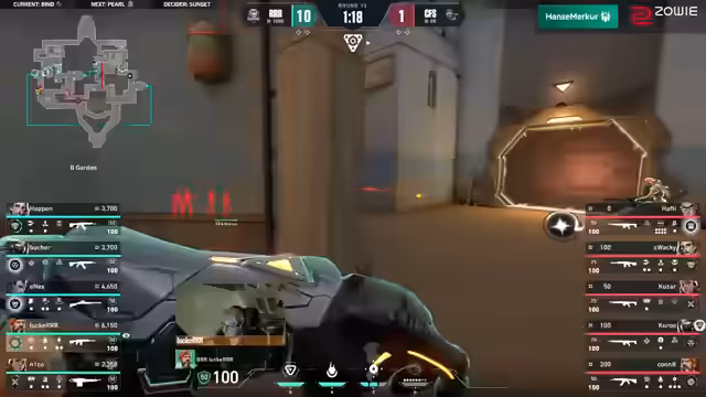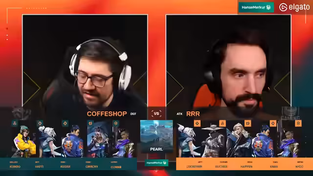 05:10:49Die erste Runde auf Pearl beginnt mit einem schnellen Shot gegen Nico von Team R, der versucht, alleine an A durchzubrechen. Team R muss hart um die Spots kämpfen, während Coffeeshop geduldig spielt und auf einen Mid-Push wartet. Laka von Team R tankt den ersten Schuss, und Hafti von Coffeeshop erzielt wichtige Kills mit der Sheriff. Es gibt eine kurze Verwirrung bezüglich eines möglichen Spielerwechsels bei Coffeeshop, da das Spielerbild von Matrix mit einem Ovation Jersey angezeigt wird. Coffeeshop entscheidet sich für Doppelscopes (Outlaw und Marshall), aber Laka wird aufgedeckt und von Akusa ausgeschaltet. Trotzdem gelingt es Team R, Druck aufzubauen und einen Spike Plant zu sichern, während Hafti von Coffeeshop mit der Operator wichtige Kills erzielt und sein Team im Spiel hält.