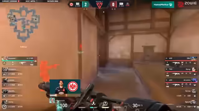 02:02:14In der nächsten Buy-Runde zündete Gesichtenhausen die Tour de Force und kündigte einen Angriff Richtung B an. Überraschenderweise waren jedoch nur Sage und Chamber mit seiner Tour de Force aggressiv an A. Terox zeigte eine bockstarke Leistung, indem er zwei Spieler der SGE ausschaltete und sich mit einem TP wieder zurückzog. Obwohl die SGE-Spieler im Heaven versuchten, die Position der Gegner ausfindig zu machen, reichte es am Ende nicht aus, um Terox aufzuhalten. Gesichtenhausen gewann diese Runde, auch dank einer cleveren TP-Nutzung von Terox, der nicht vom Spot wegtp-te, sondern auf die andere Seite der Main wechselte, womit die Gegner nicht gerechnet hatten. Dies führte zu einer Flawless-Runde für Gesichtenhausen. Trotzdem blieb Eintracht Frankfurt in Führung. Gesichtenhausen zeigte jedoch weiterhin Kampfgeist und konnte durch individuelle Glanzleistungen, insbesondere von Terox, wichtige Runden für sich entscheiden und den Rückstand verkürzen.