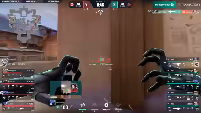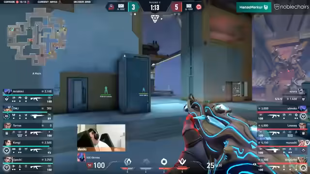 01:27:48Darkwing Jet gewann ein Duell mit der Operator in der Mitte, und Obnox fiel auf B. Die Sage-Wall wurde gespielt, und Darkwing Jet erzielte einen Backstep gegen Musashi mit der Odin, was zum Map Point für Gesichtenhausen führte. Die SGE fragte sich, ob Azuri nicht früher hätte wegschieben können. Es war eine Runde, die Frankfurt eigentlich nicht verlieren durfte. Mit 10 zu 12 musste Frankfurt eine schwierige Eco-Runde überstehen. Der Null-Command zwang Terrox, defensiver zu spielen. Zwei Spieler wurden abgefangen, doch der Spike ging durch. Musashi musste sprayen, aber der Spam ging vorbei, und Gesichtenhausen gewann die Map mit 13 zu 10. Kongi gönnte sich einen Schluck aus der Tasse, da der Sieg schmeckte. Die SGE hatte Schwierigkeiten, ihre Economy-Kontrolle zurückzuerlangen. Der Map-Pick der SGE ging an Gesichtenhausen, die damit eine gute Ausgangssituation hatten. Gesichtenhausen, die bisher ungeschlagen waren, gewannen die erste Map gegen einen starken Gegner. Nun ging es weiter mit Abyss, dem Map-Pick von Gesichtenhausen. Im Agent Select für Abyss brachte Eintracht Frankfurt den Chamber für Cypher in ihre Double Duelist Comp, um Leosens Aiming besser zu nutzen und eine Free Operator zu haben. Gesichtenhausen spielte ebenfalls mit Chamber, und Darkwing Jets Neon war wieder dabei, obwohl sie auf Abyss nicht als so stark angesehen wird. Das Spiel stand 1 zu 0 für Gesichtenhausen, und sie hatten Matchpoint für die Series und den möglichen Einzug in die Playoffs.