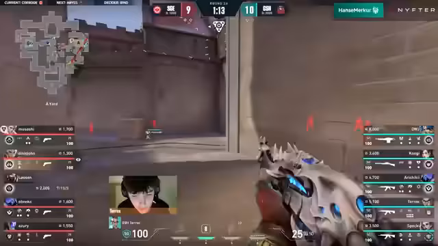 01:17:27Kongi konnte mit seiner Aktion die Economy von Frankfurt auf einem Niveau halten, das Gesichtenhausen ermöglichte, schneller die Kontrolle über das Geld zurückzuerlangen. Frankfurt musste am Drücker bleiben und startete einen Angriff auf A, wobei ein Null-Command Terrox zwang, defensiver zu spielen. Atsuki wurde hochgeholt, Terrox erzielte einen weiteren Kill, und die Odin sorgte für einen Fragg. John war alleine und verpasste es, den Spike mitzunehmen, was zu einer weiteren verrückten Runde auf dem A-Spot führte. Die SGE wurde in die nächste Eco geschickt und lief direkt in die Odin von Darkwing Jet. Terox riskierte es, die Mitte zu halten, während Frankfurt auf B blieb. Trotz guter Tempo-Versuche auf B, schien die Aufgabe für die SGE in der Eco nicht machbar. Kongi bot sich kurzzeitig Deckung mit seiner Wall, doch die Rotation wurde entdeckt. Leosen ging down, und Darkwing Jet erzielte drei Kills mit der Odin, was zum 9 zu 9 Ausgleich führte. Die Economy-Kontrolle Frankfurts war dahin, und das Spiel auf Co-Road wurde extrem eng.