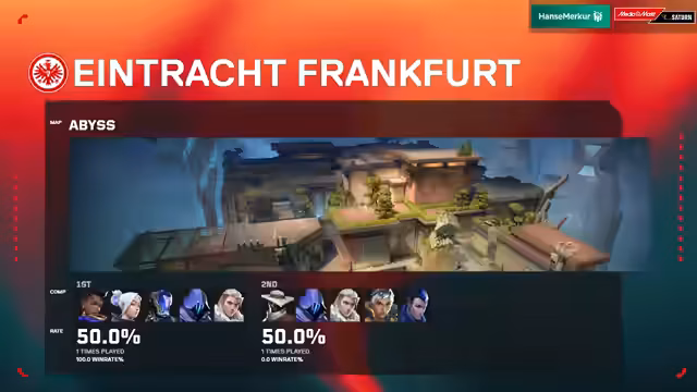 00:13:40Die erste Partie des Abends wird Eintracht Frankfurt gegen Gesichtenhausen sein. Eintracht Frankfurt tritt mit einem interessanten Line-Up an, darunter Opnox, ein Free Agent von Maus, der sich bei der SGE beweisen darf. Das Team hatte zuvor mit einem „Rentner-Line-Up“ experimentiert und ist nun gespannt, wie sich Opnox einfügen wird. Gesichtenhausen spielt mit Darkwing Jet, der für seine Neon-Odin-Kombination bekannt ist, und dem Line-Up der Vorwoche, das nach zwei Abgängen nun Arishiki und Darkwing Jet die Chance gibt, sich zu zeigen. Darkwing Jet hatte bereits mit den Permitter Unicorns für Aufsehen gesorgt. Die Zuschauer können über das Fanometer ihre Teams anfeuern. Das Map-Veto ergab, dass Eintracht Frankfurt Haven und Sunset bannt, Gesichtenhausen Pearl und Split. Corrode wird als erste Map von Frankfurt gepickt, Gesichtenhausen wählt Abyss, und Bind wird der Decider sein. Die Wahl von Frankfurt, Sunset zu bannen, könnte auf eine schmerzhafte Niederlage gegen Cloud9 in New York zurückzuführen sein, wo die SGE beim Red Bull Homeground Play-In stark spielte, aber knapp scheiterte.