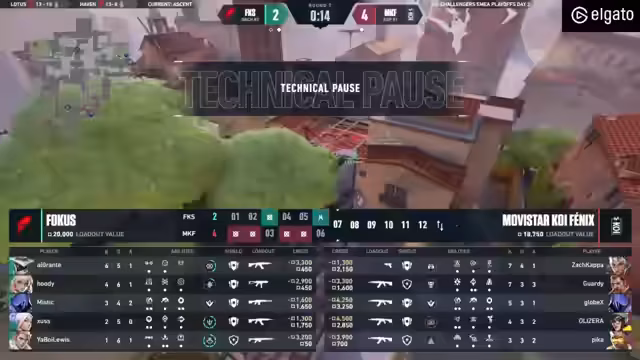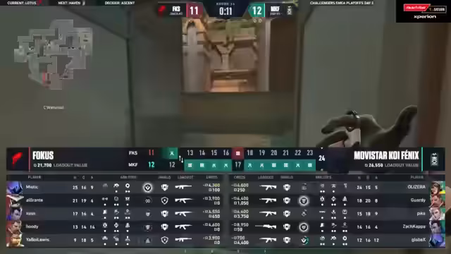 03:23:12Das Spiel erreicht einen dramatischen Höhepunkt, als beide Teams mit knappen Ressourcen in die letzte Runde gehen. FOKUS muss ohne Ultis gegen eine voll durchkaufte MKF antreten. Ein cleveres TP-Play von Mystic, das leider knapp fehlschlägt, und ein perfektes Reveal von Oli Sera gegen Mystics Ultimate entscheiden eine knapp verlorene Runde. MKF nutzt effektiv Rocket-Würfe und einen Explosions-Timing-Gewinn, während FOKUS ihre letztes Timeout nutzt, um sich neu zu organisieren. FOKUS kämpft tapfer, aber MKF nutzt ihre finale Überlegenheit am Spike, um mit 13-12 zu gewinnen und FOKUS aus den Playoffs zu eliminieren.