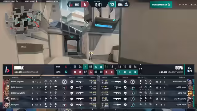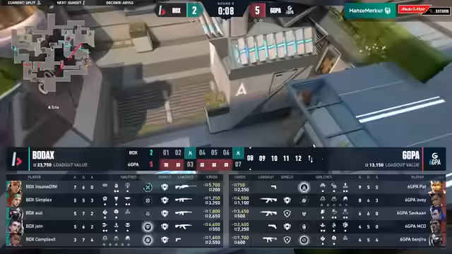 03:20:59Die zweite Halbzeit auf Abyss beginnt mit einer knappen 7:5-Führung für Bodax Gaming, die sich in der Defensive erspielt wurde. 6GPA startet aggressiv in die Attack-Runde, aber ein technisches Problem oder ein Missplay von Simplex bei Bodax führt zu einem unerwarteten Clutch von MCD, der 6GPA den Ausgleich sichert. Die Economy wird zunehmend zum entscheidenden Faktor, da beide Teams um die Kontrolle ringen. Bodax versucht, mit Stinger-Force-Buys das Blatt zu wenden, während 6GPA durch gewonnene Runden und Spike Plants ihre Finanzen stabilisiert. Die Distanzen auf Abyss machen Waffen wie die Guardian attraktiv, und die Teams nutzen ihre Utility, um Vorteile zu erzielen. Trotz guter Ansätze von Bodax, insbesondere durch Yuis herausragende Einzelleistungen, gelingt es 6GPA, die Führung zu übernehmen und ihre Kontostände weiter auszubauen. Die Konzentration lässt auf beiden Seiten nach, was zu riskanten Peaks und Fehlern führt, doch 6GPA beweist im Retake eine starke Leistung und sichert sich weitere Runden, was Bodax Gaming in eine schwierige Lage bringt.