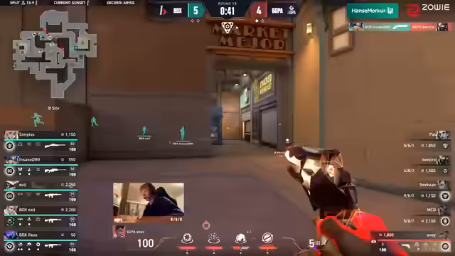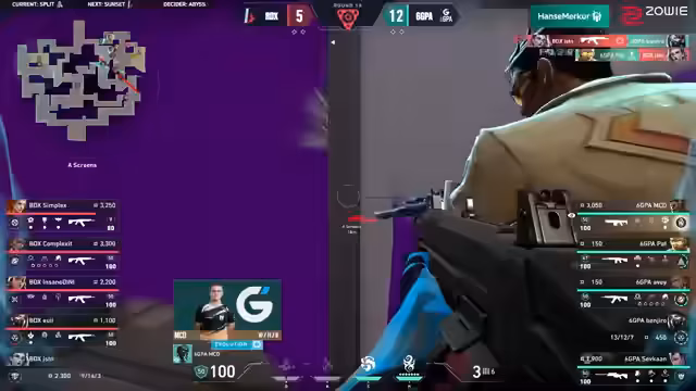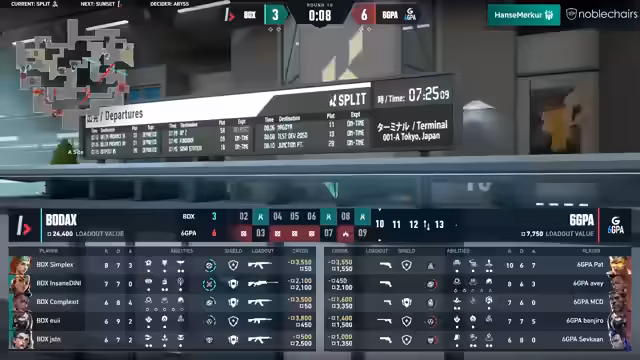 02:26:576GPA steht vor der Mammutaufgabe, acht Runden in Folge zu gewinnen, um die Overtime zu erzwingen und eine dritte Map zu verhindern. Die Spieler von 6GPA zeigen sich unzufrieden mit ihrer Leistung. Bodax hingegen hat ein klares Ziel: den A-Spot zu erobern. Trotz eines Judge-Duells im Elbow, das MCD gewinnt, wird er sofort getradet. Bodax nutzt geschickte Timings und Laufwege, um Lücken in der Verteidigung von 6GPA auszunutzen. Yui und Nail agieren effektiv, wobei Yui große Räume cleart und B-Positionen überprüft. Bodax spielt einen Plant an der Seite und überrascht Benjiro im Markt, während die Kamera an CT zerstört wird. Mit einer Drohne sichern sie sich die Rampe, die von 6GPA nicht mehr kontrolliert wird. Trotz eines kleinen Stacks von 6GPA an A zieht sich Bodax zurück und geht durch den Market auf den schwächer besetzten Spot. Simplex erzielt zwei Kills, was zu einem 12:4 für Bodax Gaming führt. Bodax gewinnt die Halbzeit mit einem Flawless Attack, was sie mit viel Momentum auf die dritte Map Abyss bringt und 6GPA vor große Probleme stellt, da ihr neu zusammengewürfeltes Team noch nicht lange existiert. Die Doppel-Sentinel-Comp von Bodax war sehr sicher, und ihr fehlerfreier Angriff überrascht viele.