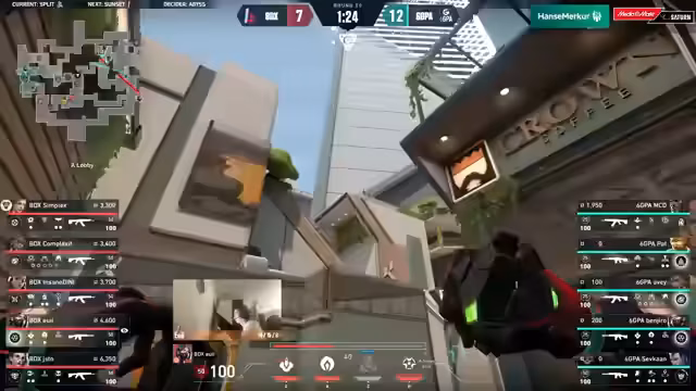 01:58:016GPA zeigt sich mutig in der Raumeroberung, während Bodax auf kleinere Waffen zurückgreifen muss. Eine aggressive Push-Strategie von Bodax mit Dini auf Bucky wird durch 6GPAs diszipliniertes Anhalten der Smoke und das Auslösen des Choke-Holds gekontert, was zu einem Vorteil für 6GPA führt. Trotzdem zieht 6GPA ein Timeout, um sich neu zu sortieren, da sie den schnellen Backstab von Bodax nicht erwartet hatten. Yui von Bodax erzielt ein 4K, was die Runde für Bodax sichert und 6GPA in eine Eco-Runde zwingt. Die Economy von 6GPA verschlechtert sich, während Bodax durch den Gewinn der Eco-Runde ihren Ult-Vorteil stabilisiert. Dini von Bodax zeigt sich immer stärker, erzielt ein Full House und sichert Bodax eine 7:5 Halbzeitführung. Die zweite Partie des Tages zwischen Coffeeshop und Small Crew wird ebenfalls erwähnt, wobei Bodax und 6GPA um den Titel der Pokal-Champions kämpfen. Bodax baut ihre Führung weiter aus, während 6GPA Schwierigkeiten hat, sich zu wehren, was zu einem 12:4 für Bodax Gaming führt und sie an den Matchpoint bringt.