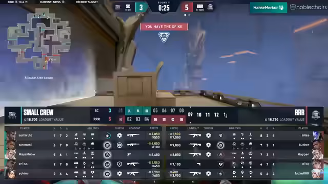 01:17:04Die Small Crew startet in die zweite Map mit viel Hoffnung und kämpft sich zurück in das Spiel durch einen beeindruckenden Force Buy und clevere Positionierungen. Spieler wie Maya und Yukine zeigen hervorragende Einzelleistungen und tragen entscheidend zum Sieg bei. Trotzdem gelingt es R, mit konstanter Firepower und taktischer Disziplin das Spiel zu kontrollieren. Die Small Crew kämpft zwar wacker, kann aber letztlich nicht an ihre Anfangsphase anknüpfen und verliert die Map mit 13:7.