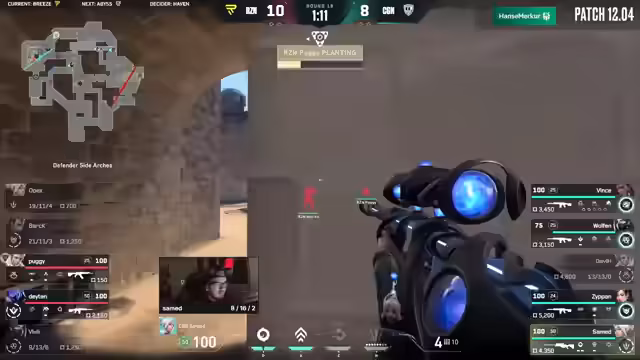 03:45:20Ryzen startet die Map in der Defense und hat hier, ähnlich wie im vorherigen Spiel gegen die Playing Ducks, mit Startschwierigkeiten zu kämpfen. Kommentatoren bezweifeln, ob die ungewöhnliche Brimstone-Komp die nötige Wirkung auf der großen Karte erzielt, da die Rotationen lang sind. Die Runden werden von CJN dominiert und Ryzen agiert überfordert, was zu einem deutlichen Rückstand führt. CJN wirkt dabei sehr abgeklärt und souverän.