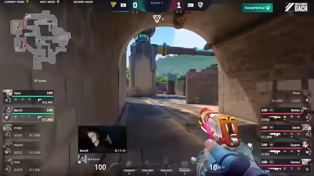 00:36:53Die erste Map Haven beginnt. E-Sports Cologne greift zuerst an und nutzt eine unkonventionelle Double Duelist-Komposition mit Waylay Neon. Sie gewinnen die Pistolenrunde durch eine aggressive mittige Attacke und überraschen Fokus. Fokus kann jedoch in der Folge Runde zurückschlagen. Die Partie verläuft sehr eng, doch Fokus nutzt eine kluge Taktik mit einer tiefen Smoke am A-Spot, um eine Überzahl zu erzeugen und die Führung zu übernehmen.