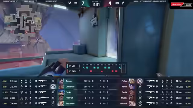 03:32:40Das Spiel auf der Map Abyss beginnt mit einem intensiven Start. Fokus verliert die erste Runde knapp, auch wenn sie nach einem erfolgreichen Retake in eine gute Position kamen. Die Runde verdeutlicht, wie wichtig präzises Aiming und taktische Entscheidungen sind, insbesondere gegen ein Team wie Vitality. Fokus wechselt zu einem B-Site Push, während Vitality sehr passiv agiert und einige frühere Angriffe abwehrt. Die Duelle sind extrem ausgeglichen, was die Spannung im Game auf einem hohen Niveau hält.