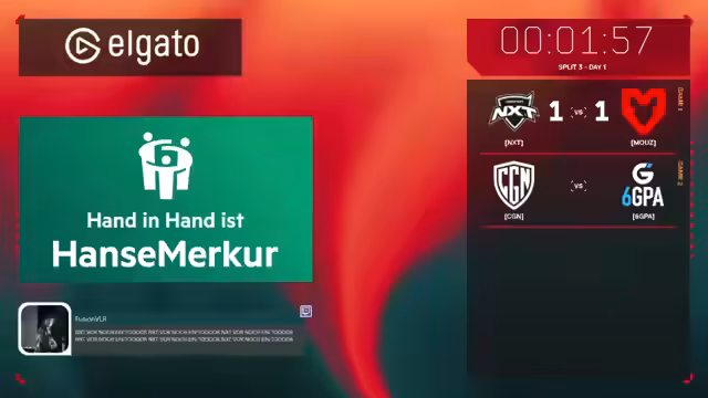00:10:31Der Streamer begrüßt das Publikum zur HanseMerkur Challengers DACH Split 3, Woche 1, Tag 2 und fährt die Show allein, da der Co-Host später kommt. Er erinnert an die bisherigen Spiele der Saison: Eintracht Frankfurt gewann den Auftakt 2:1, gestoren ging es bei Fokus gegen Ryzen ab, trotz eines 13:3-Sieges auf der ersten Map für Fokus. Ryzen konnte die nächsten beiden Maps mit 13:11 bzw. 11:11 und einem Overtime-Sieg auf Haven für sich entscheiden, was ein großes Upset darstellte.