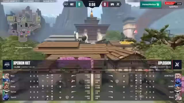 04:19:34Die zweite Map beginnt auf Sunset mit Explosion auf der Verteidiger-Seite. Beide Teams wählen ungewöhnliche Agenten-Kombis: Explosion setzt auf eine Double-Controller-Strategie ohne Flashes, während sich NXT für Breach und Chaos entscheidet, um den starken Cypher von Explosion zu kontern. Das Spiel startet mit einem aggressiven Contact Go von NXT.