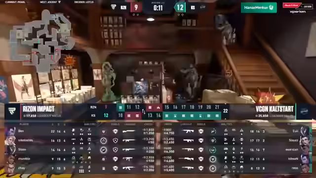 00:32:38Obwohl Ryzen Impact nach einer starken ersten Hälfte mit 5:1 führte, gelang es Kaltstadt, das Spiel zurück zu drehen. Durch einen geschickten, wenn auch teuren, Einsatz von Ultimates wie Run It Back und einem gut platzierten Jäger-Klon, gewann das Team die Runden 7 und 8. Das Momentum schlug zu Gunsten von Kaltstadt um, was vor allem der starken Einzelleistung von Erslan zu verdanken ist. Sie beendeten die erste Hälfte mit 6:6, was das Spiel wieder völlig offen gestaltete und ihnen eine wichtige moralische Rückendeckung verschaffte.