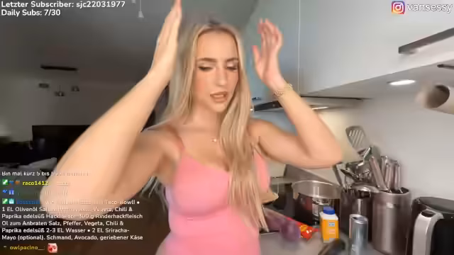 00:05:10Vansessy präsentiert die Zutaten für ihr Lachs-Pasta-Rezept: Spagettini, Zucchini, Parmesan, Sahne und eventuell Frischkäse oder Ricotta. Sie betont die Begeisterung für das Rezept und beginnt mit der Zubereitung. Während des Kochens unterhält sie sich mit dem Chat über verschiedene Themen wie OnlyFans-Erfahrungen, psychische Gesundheit und Routine im Alltag. Sie betont, dass sie ihre Einnahmen aus OnlyFans reduzieren möchte und sich mehr auf ihren Twitch-Kanal konzentrieren will.