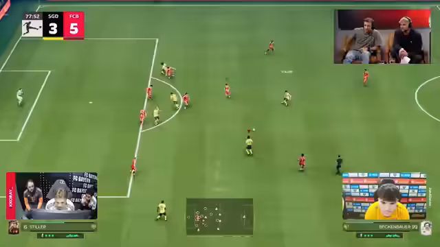 00:37:12Der Stream startet mit dem Duell zwischen Borussia Dortmund und dem FC Bayern München. Beide Teams nutzen ihre 99er-Karten (z.B. Kane, Musiala, Wöllner). Das Spiel erweist sich als hochoffensives und torreiches Spektakel. Die Bayern nehmen durch Koray früh die Führung, doch der BVB gleicht aus. Bayern geht wieder in Führung. Die Tore werden nach jedem Treffer ausführlich analysiert, wobei der FC Bayern am Ende mit 5:3 gewinnt.