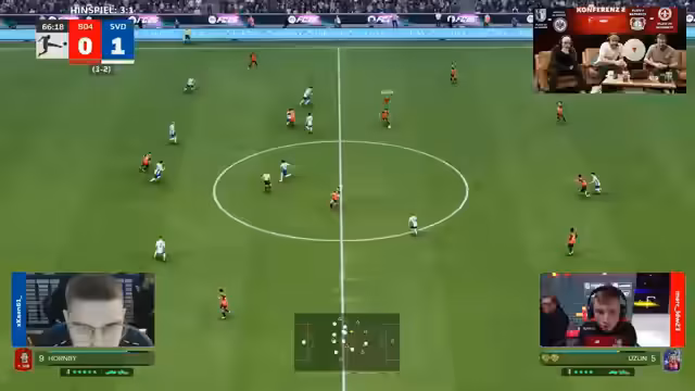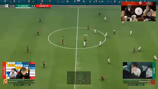 00:40:59Der Stream schaltet live ins erste Spiel zwischen Kaiserslautern und Düsseldorf. Fabio für den FCK stellt früh eine gute Chance her, kann aber keinen erzielen. Kurze Zeit später gibt es eine kontroverse Szene, als ein FCK-Spieler im Strafraum gefällt wird, die aber nicht als Strafstoß gewertet wird. Parallel dazu deutet sich auch im Mainz-Spiel eine klare Tendenz an. Bremen geht durch einen Treffer von Boniface in Führung und das Spiel für Mainz wird ungleich schwerer, eine Wende zu erzielen.