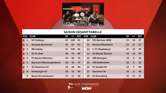 03:03:26Die Kommentatoren diskutieren die Titelfavoriten der VBL-Saison. Während Werder Bremen mit Megabit und Moobat, Heidenheim mit Dennis Müller und Serhatinho sowie RB Leipzig mit Umut Gültikin und Anders Fergang genannt werden, wird der SC Freiburg für die kommende Saison als möglicher Kandidat für die Trophäen-Schale gehandelt. Die Schale selbst wird als Motivation für den Titelkampf bezeichnet und ihre Bedeutung betont. Es wird die Frage aufgeworfen, wer die Schale als Erster in diesem Jahr gewinnen wird.