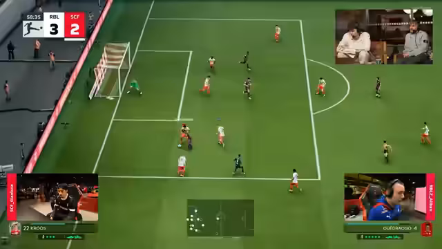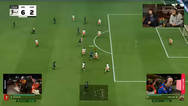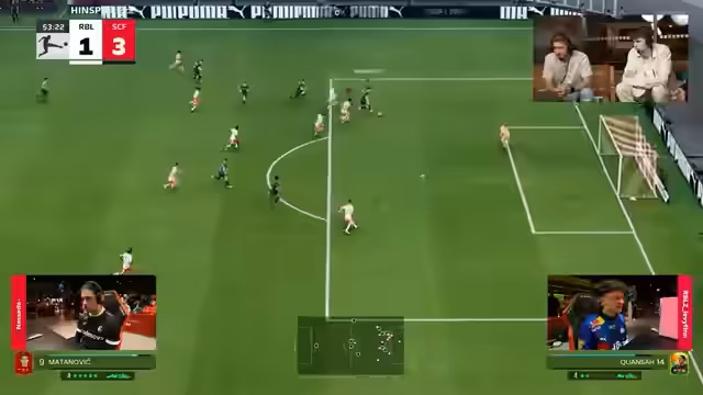 05:01:42Nasada (SC Freiburg) versucht gegen Levi Finn (RB Leipzig) einen 4-Tore-Rückstand aufzuholen. Nasadas Speed und seine 4-4-2-Taktik führen schnell zu Torchancen, während Levi bewusst langsamer spielt, um Nasada aus dem Rhythmus zu bringen. Ein Solo-Tor von Nasada (2:1) mit einem Advanced Roulette zeigt sein Können, aber Levi hält das Spiel unter Kontrolle. Im Parallelspiel von Juval gegen Marc (1:3) verpasst Paderborn Chancen; Experten diskutieren den psychologischen Druck, drei Tore aufzuholen. Ein erneutes Tor von Nasada (3:1) weckt Hoffnungen, doch Levi bleibt favorisiert mit seiner Erfahrung.