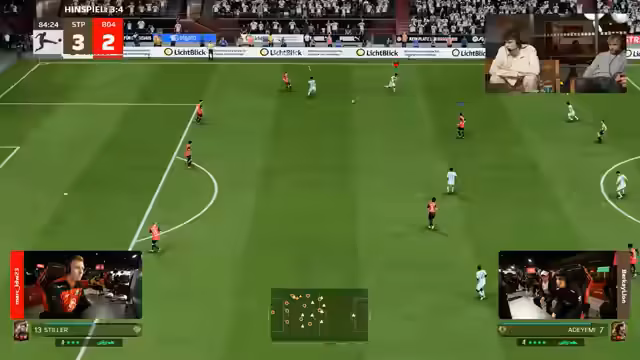04:02:47In den Schlussphasen der Spiele bleibt die Spannung aufrecht. Die Partie zwischen Leverkusen und St. Pauli endet 3:3 und geht in die Verlängerung, was zeigt, dass selbst ein Rückstand im Hinspiel wettgemacht werden kann. Parallel dazu liefert sich Juwal und Justinho einen dramatischen Schlagabtausch. Nachdem Juwal das Spiel mit 6:3 für Paderborn gedreht hat, zwingt ihn Justinho in die Verlängerung. Kommentator Timo lobt die Moral der Dresdner Fans im Chat, die das Team durch die kritische Phase tragen. Auf allen Plätzen wird die Nervosität spürbar, da ein einziges Tor die Entscheidung über das Viertelfinale bringen kann.